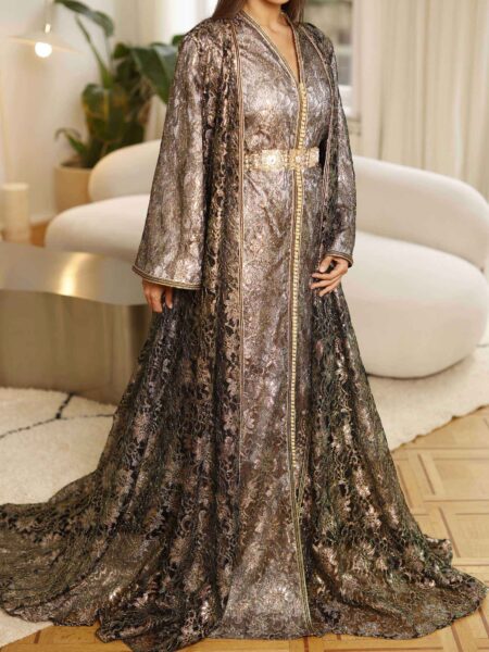 – A3kad sur la longueur de la robe : Les détails en A3kad parcourent la longueur de la robe