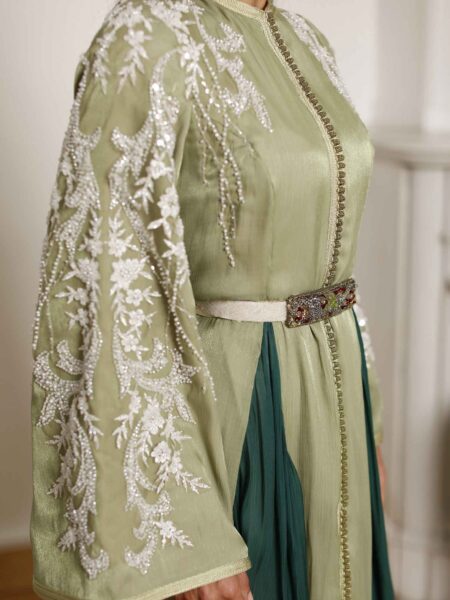 – A3kad de couleur sur la longueur de la robe : Les détails en A3kad parcourent la longueur de la robe, apportant une dimension supplémentaire de splendeur et de raffinement.