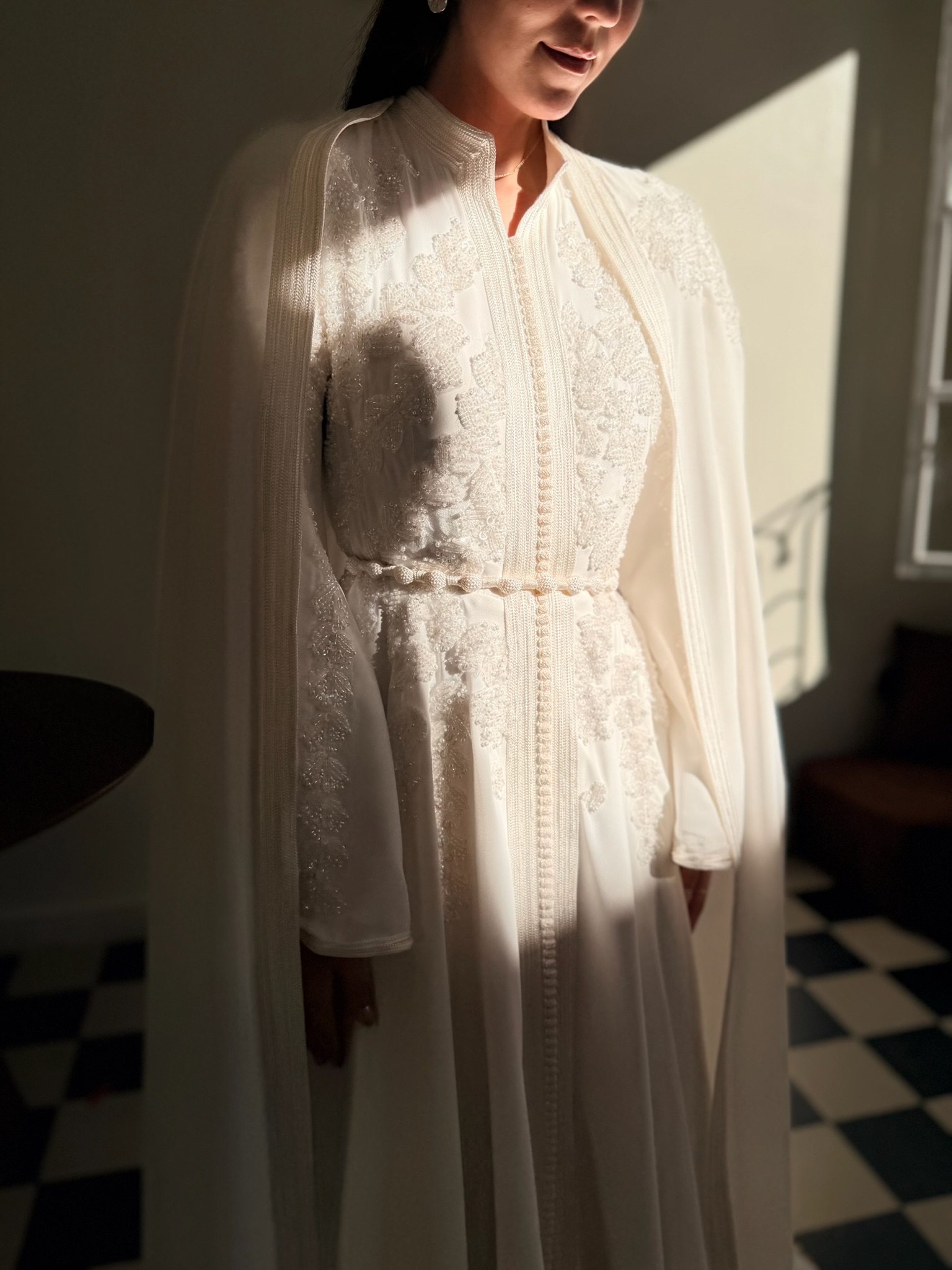 – A3kad blanc cassé sur la Longueur de la Robe : Les détails en A3kad blanc cassé parcourent la longueur de la robe, apportant une dimension supplémentaire de splendeur et de raffinement.