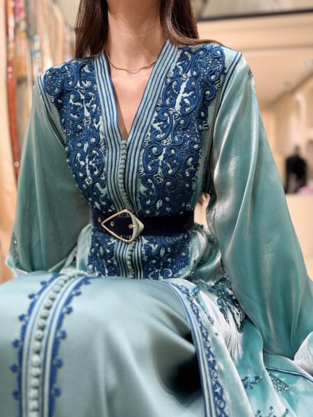 – A3kad de couleur sur la longueur de la robe : Les détails en A3kad bleu turquoise en skali parcourent la longueur de la robe, apportant une dimension supplémentaire de splendeur et de raffinement.