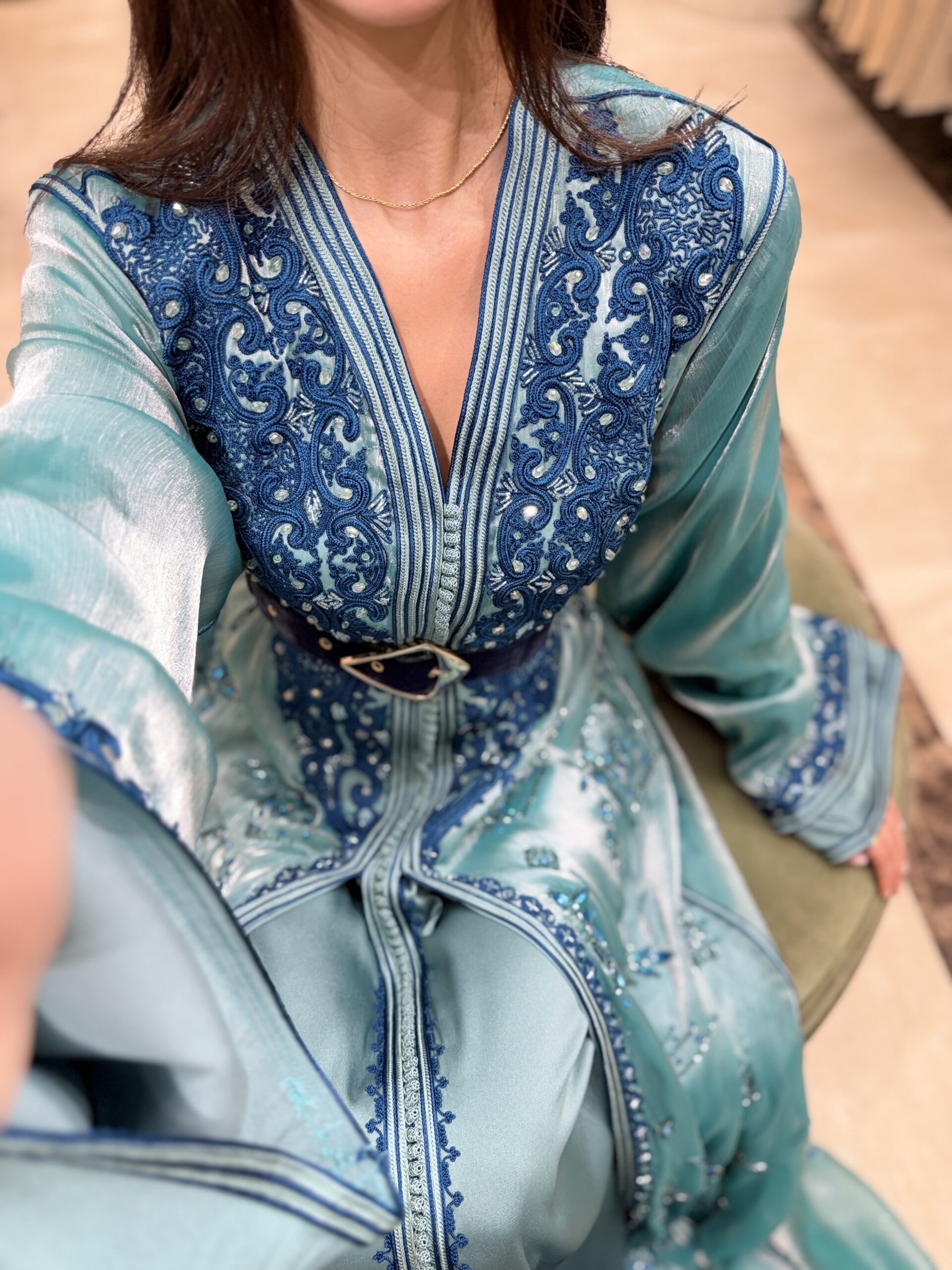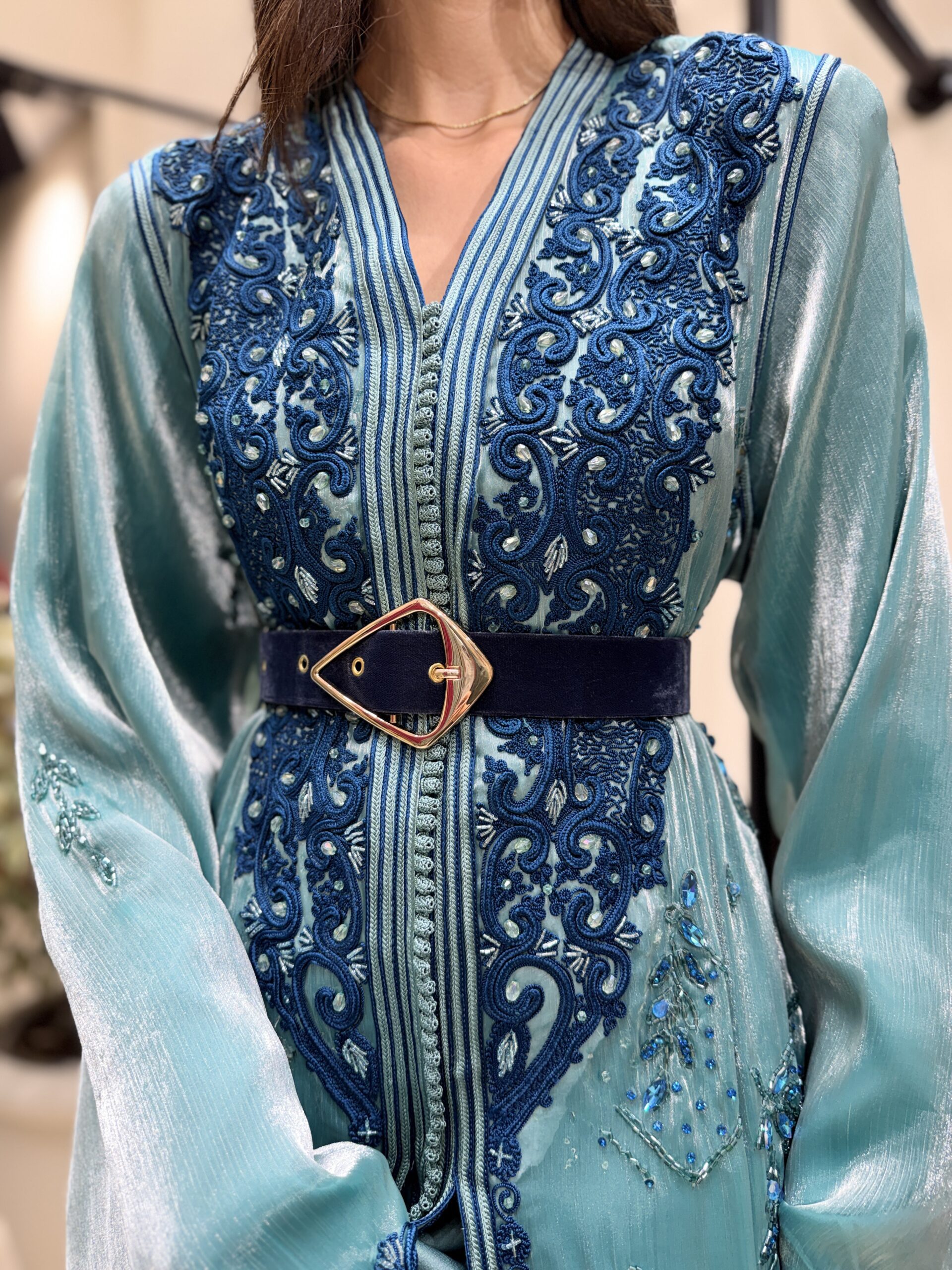 – Tissu : première pièce en crêpe bleu turquoise, la deuxième est pièce est en organza de soi perlé dans des tons bleu sur laquelle du chrol de m3alem a été fait en bleu émeraude entièrement sur le buste et les manches puis perlé à la main