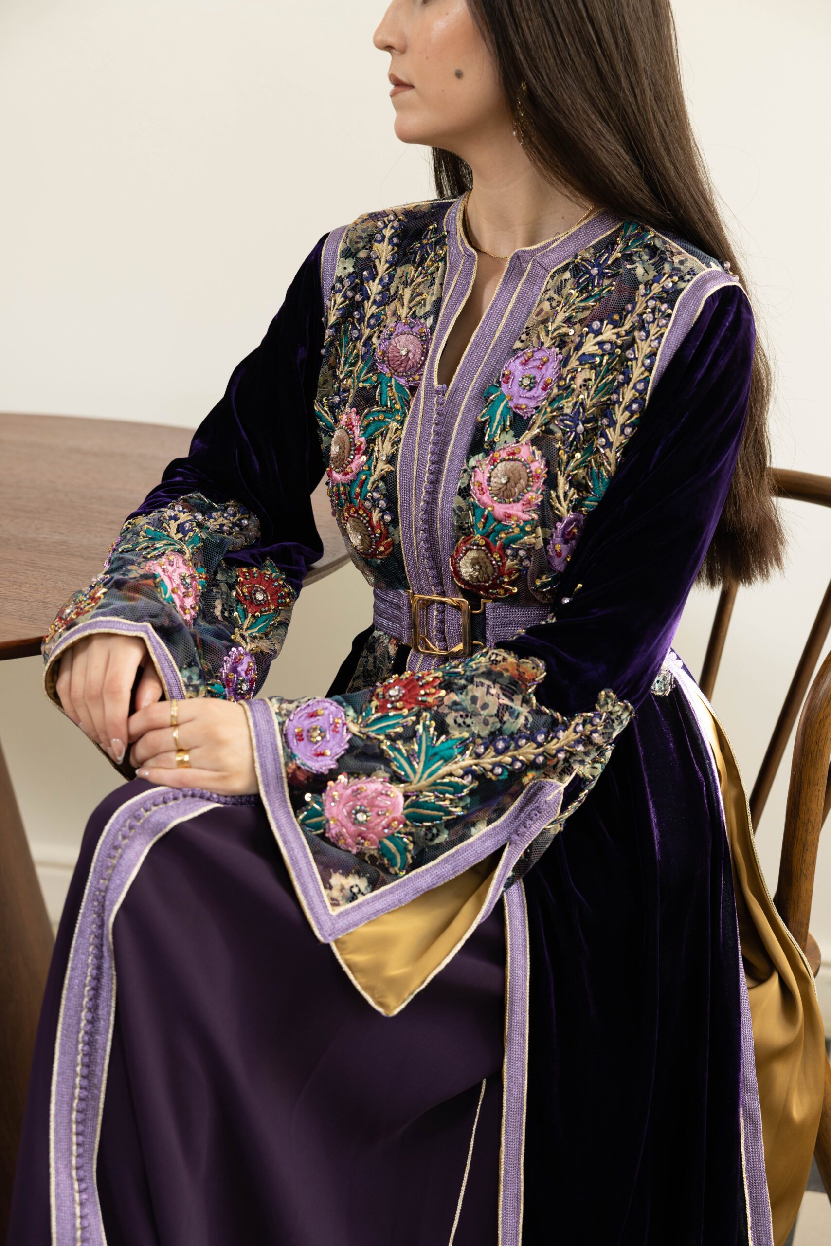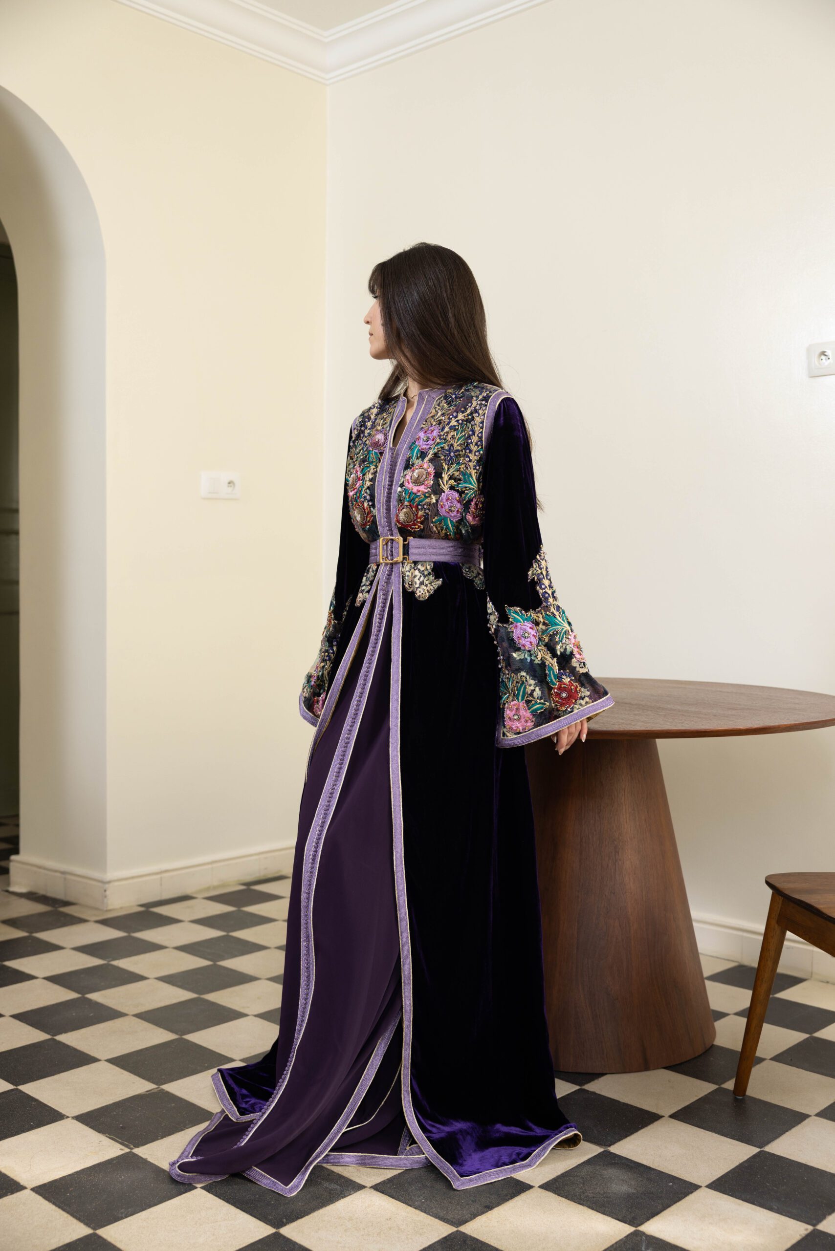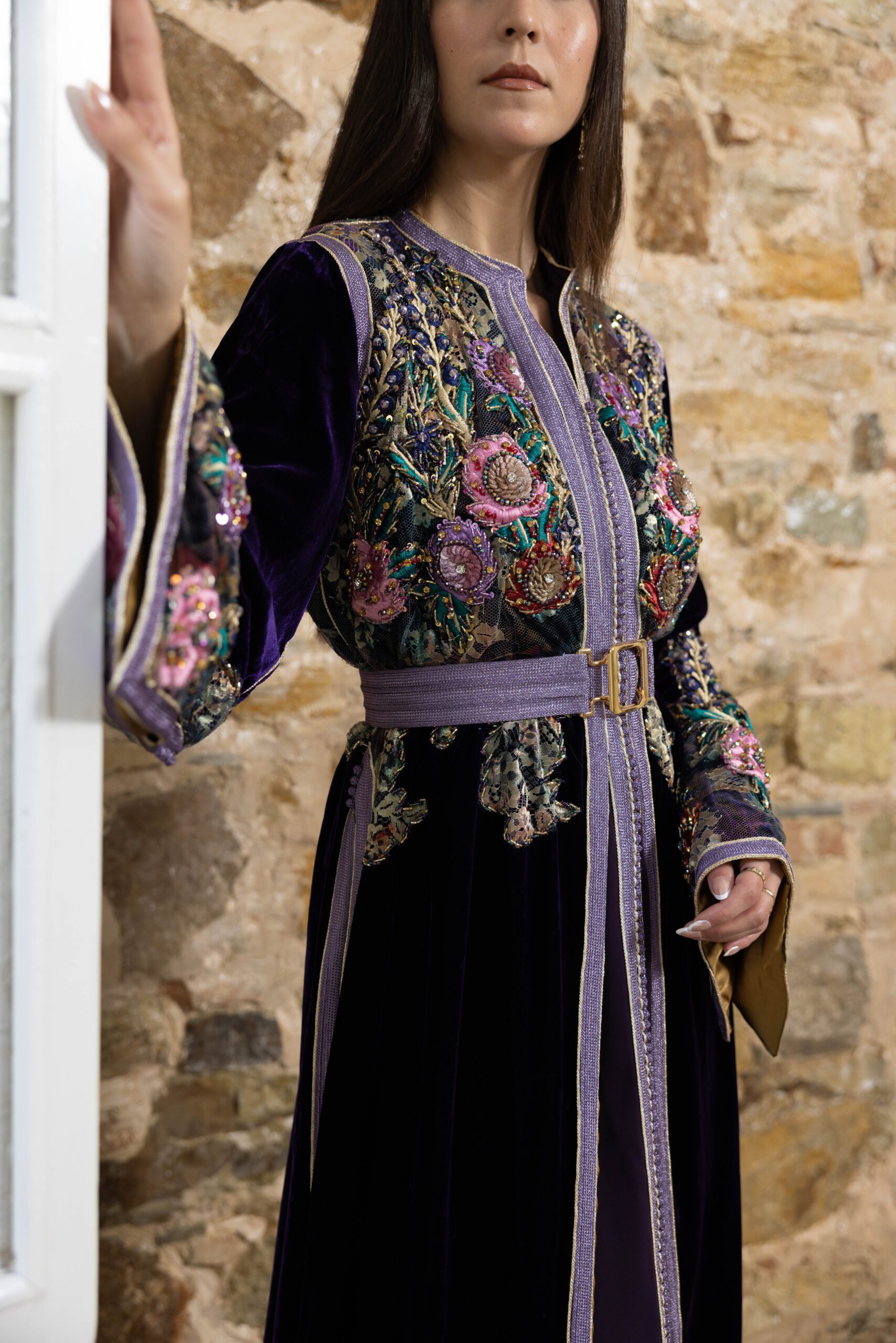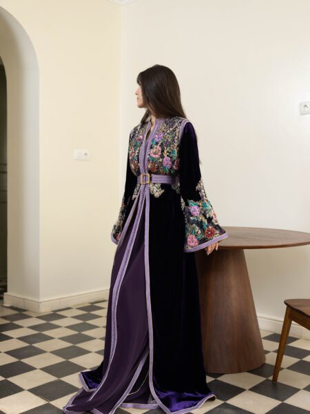 – A3kad de couleur sur la longueur de la robe : Les détails en A3kad Lila parcourent la longueur de la robe, apportant une dimension supplémentaire de splendeur et de raffinement.