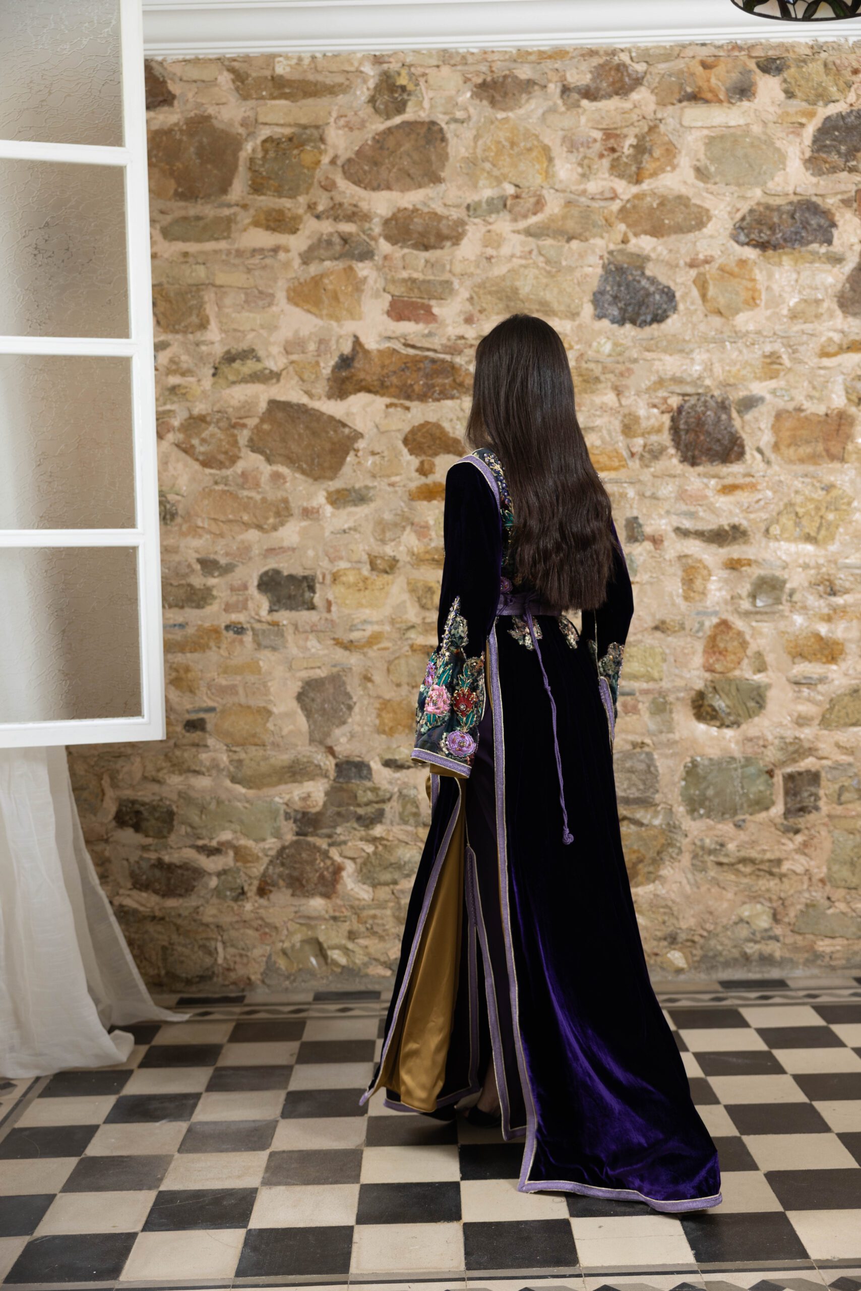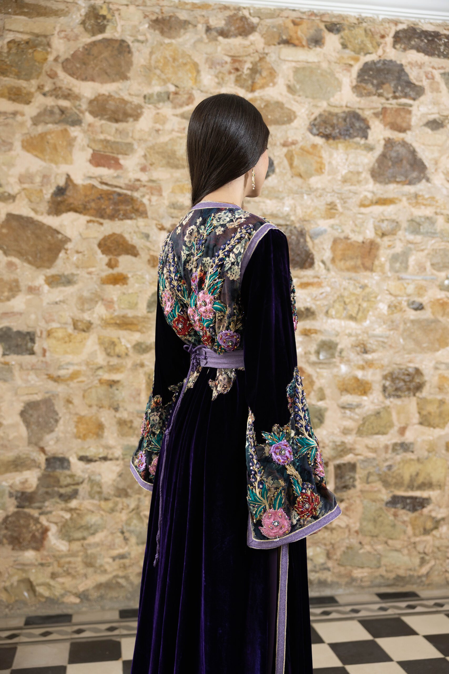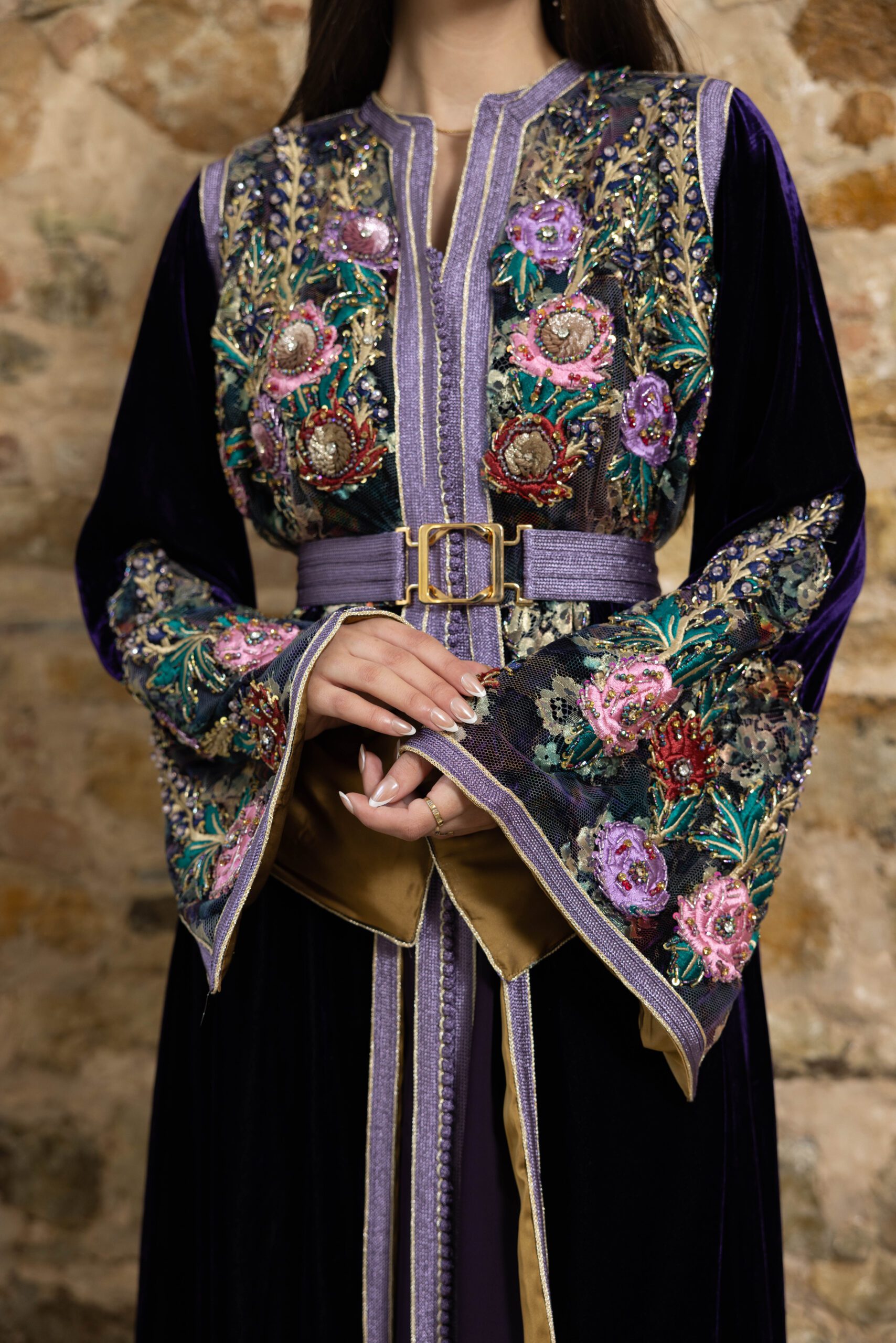 – A3kad de couleur sur la longueur de la robe : Les détails en A3kad Lila parcourent la longueur de la robe, apportant une dimension supplémentaire de splendeur et de raffinement.